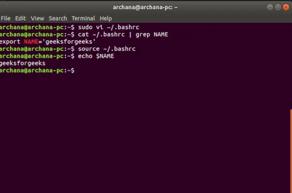 Paso 2: Edite el archivo específico del usuario (por ejemplo,~/.bashrc>) usando un editor de texto.