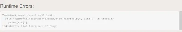 # Python program to illustrate # the NZEC Error # Driver Code if __name__ == '__main__': arr = [1, 2] # Runtime Error # Array Index out of Bounds print(arr[2])>